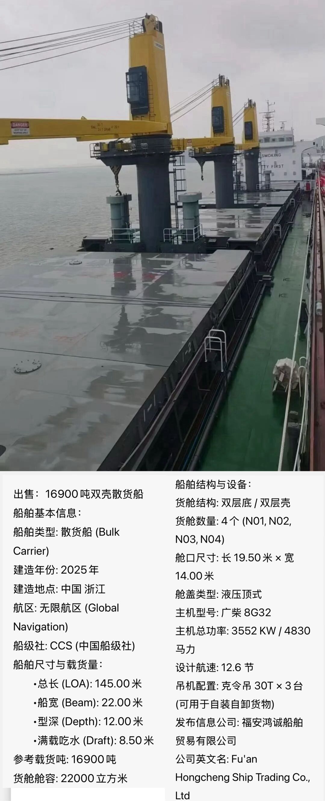 - 出售2025年浙江造16900吨双壳散货船 船舶类型:散货船 建造地点:浙江 建造时间:2025年 船级:CCS